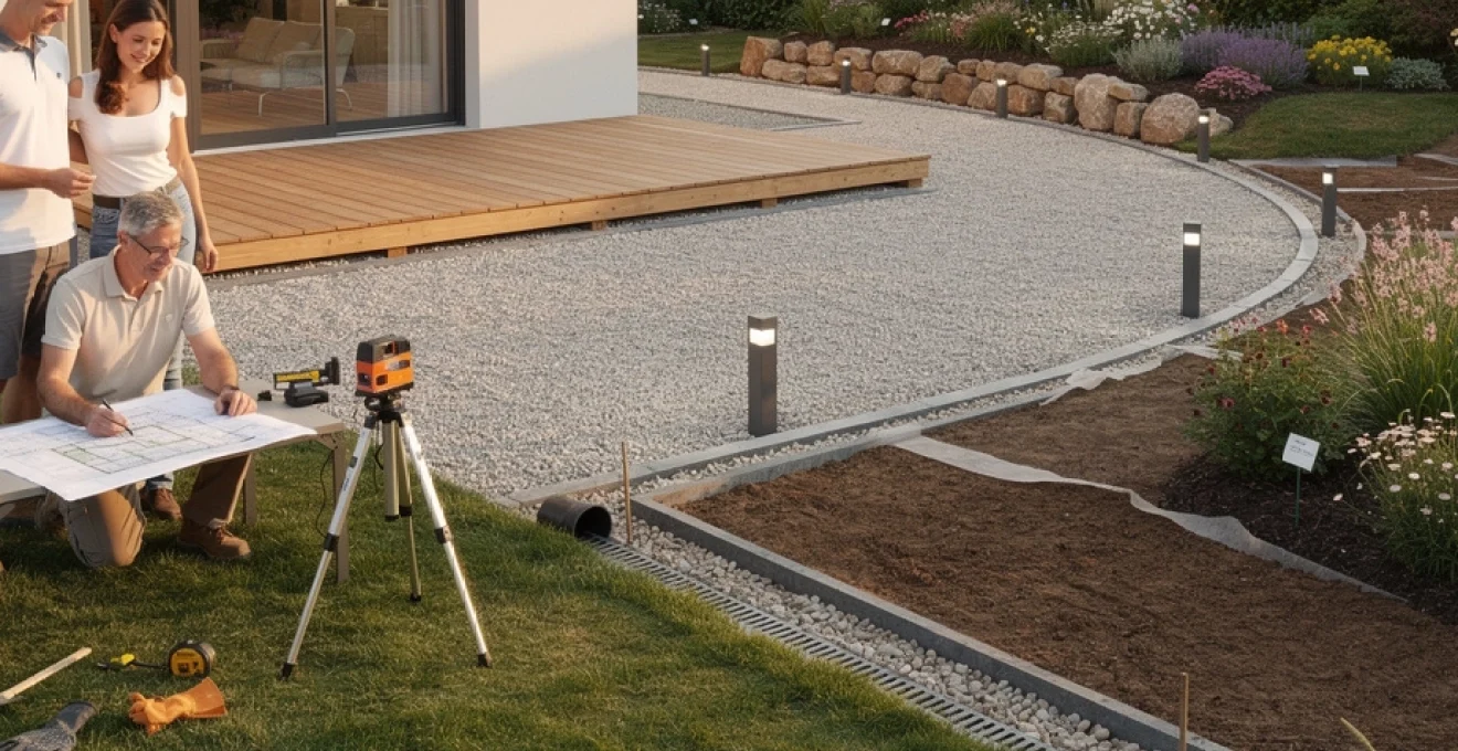 Le nivellement au laser permet d’obtenir des pentes précises sur l’ensemble du terrain, en assurant une évacuation optimale des eaux de pluie et une stabilité des revêtements. Grâce à un niveau laser rotatif et à une règle graduée, le terrassier peut contrôler en temps réel les hauteurs de déblai et de remblai. On vise généralement une pente minimale de 1 à 2 % pour les terrasses et allées, suffisante pour l’écoulement sans être perceptible à la marche.